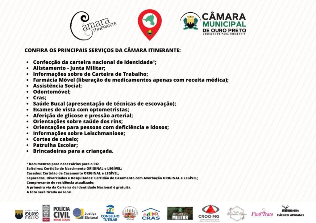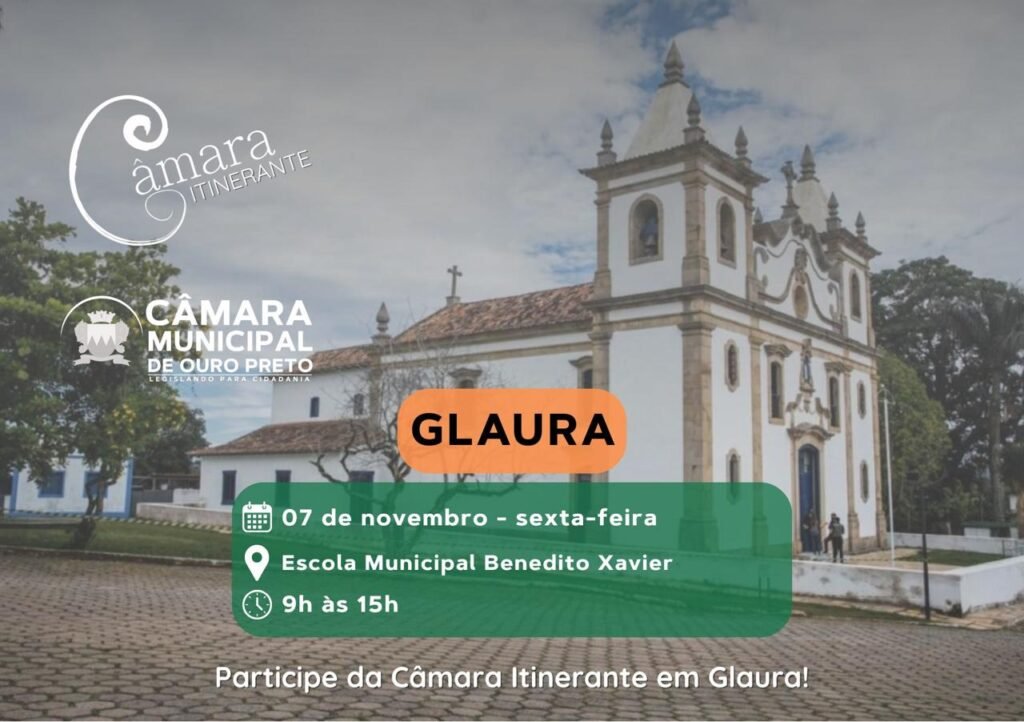 Após percorrer os outros onze distritos ouro-pretanos desde o mês de março, a Câmara Itinerante conclui a sua edição 2025 em Glaura, nesta sexta-feira, dia 7 de novembro, na Escola Municipal Benedito Xavier, de 9h às 15h, com diversas atividades gratuitas para a população.